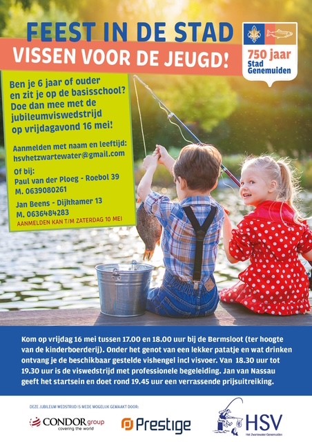 De viswedstrijd is mogelijk gemaakt dankzij steun van Condor Groep, Prestige Print en Sign en visvereniging HSV. Zij zorgen onder meer voor hengels, emmers, voer en catering, zodat de jonge vissers volledig verzorgd aan de slag kunnen.