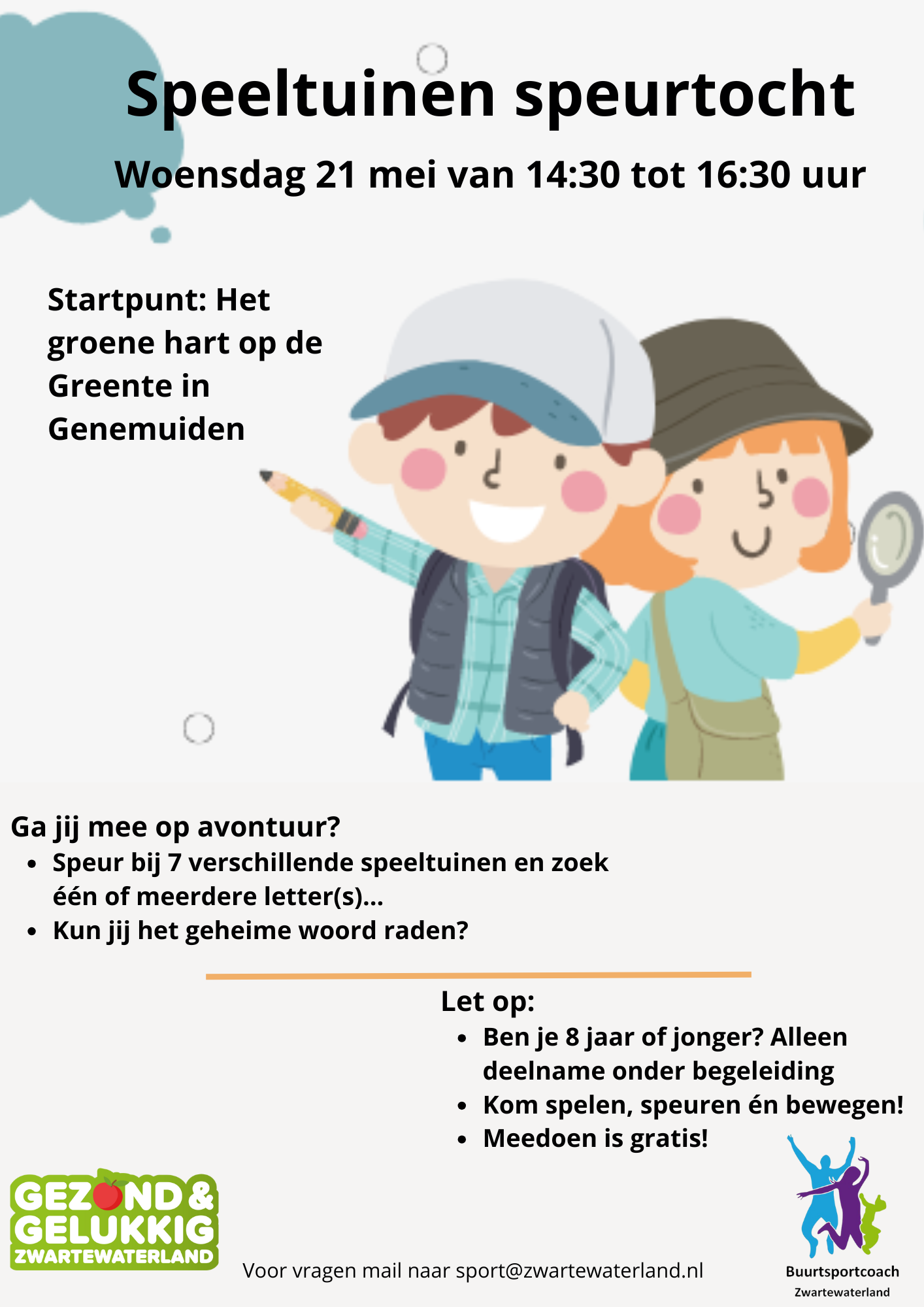 Doe mee aan de SpeeltuinSpeurtocht op de Greente, nodigt de buurtsportcoach uit. “Er zijn veel speeltuinen vernieuwd en jullie gaan in deze speeltuinen opzoek naar een aantal letters die een woord vormen. Je bent welkom ergens tussen 14.30 en 16.30.”