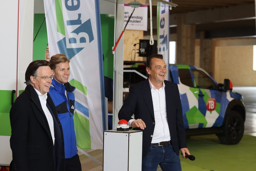 Samen met OK-voorzitter Herman de Haan en Bernardo Eenkhoorn van Breman Installatie verrichte Bilder de openingshandeling. Na het indrukken van een rode knop kwam de brandweer met toeters en bellen de hoek om rijden.
